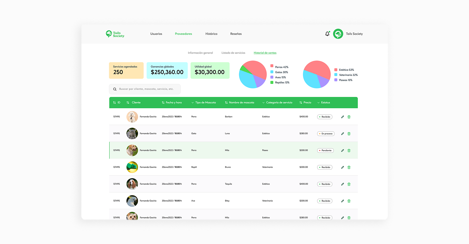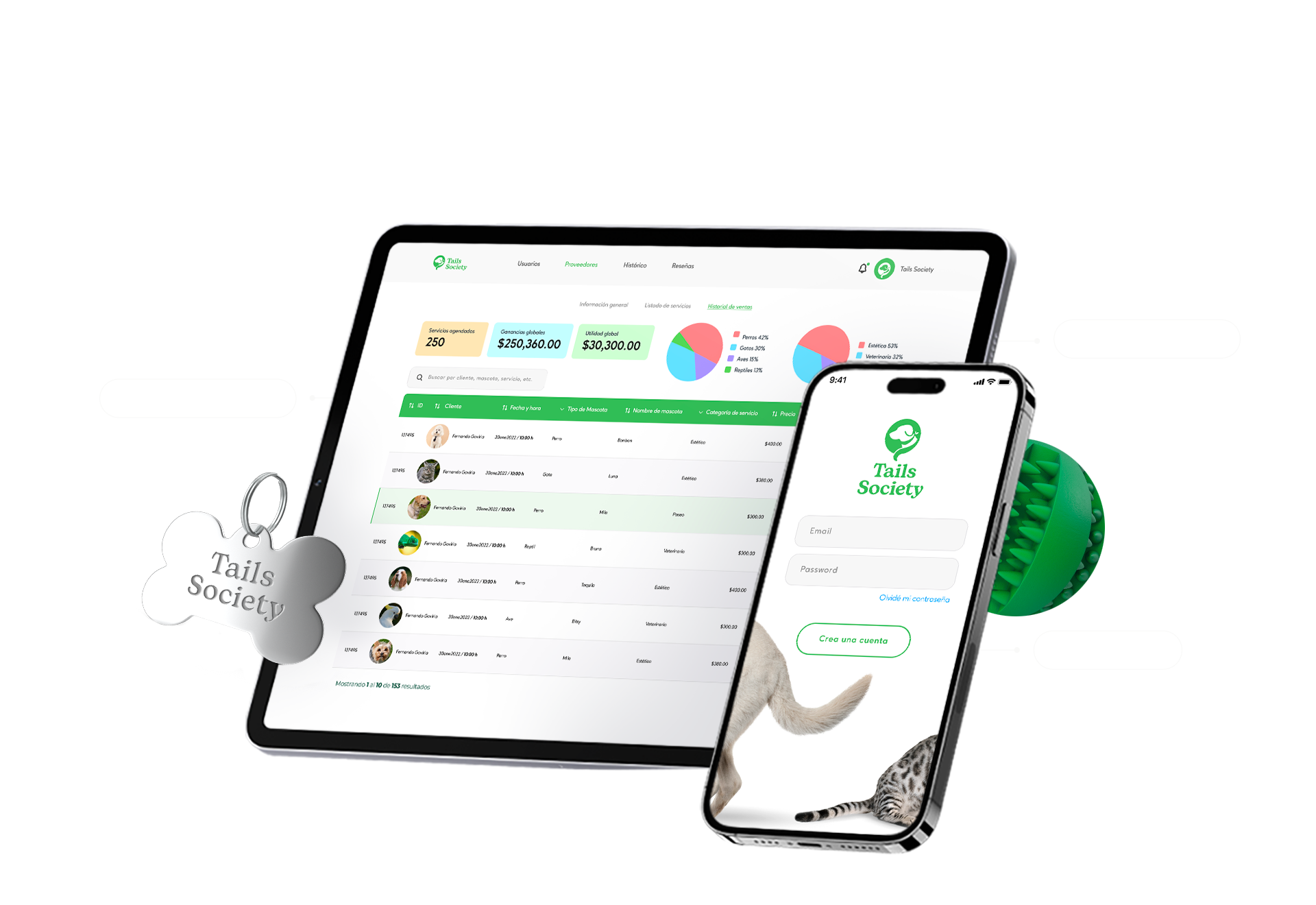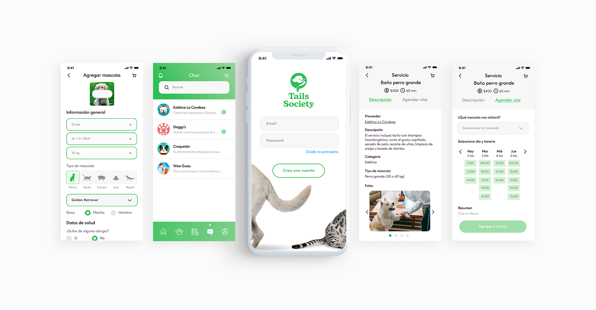 Tails Society es aplicación móvil tipo market place de proveedores en el sector de mascotas donde los usuarios podrán encontrar, agendar y pagar servicios de veterinarias, hoteles y estéticas de una variedad de proveedores.